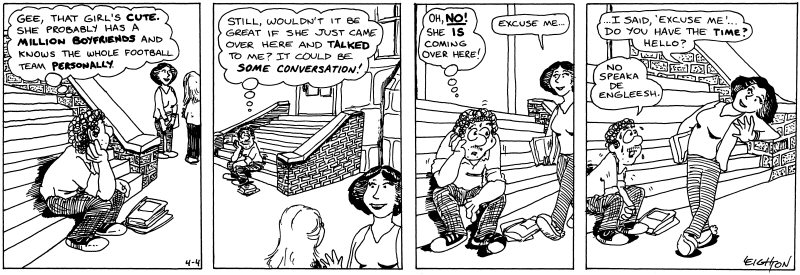 | Stuart [sitting on steps of Univesity Hall, thought bubble]: Gee, that gitl's cute. She probably has a million boyfriends and knows the whole football team personally. | |