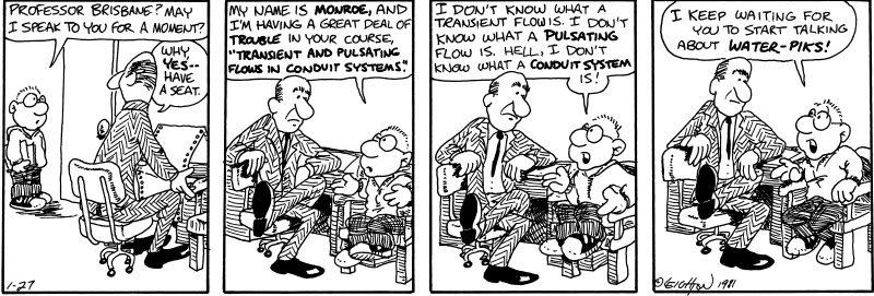 Monroe: My name is Monroe, and I'm having a great deal of trouble in your course, "Transient and Pulsating Flows in Conduit Systems." | |